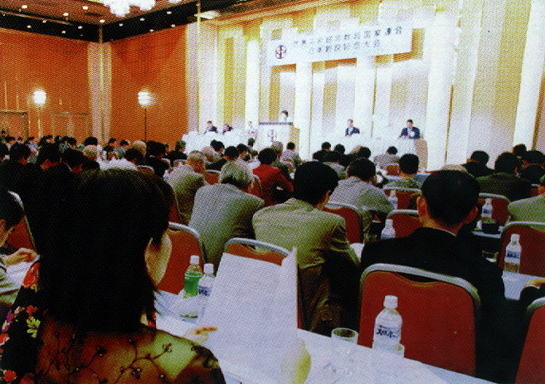 | ▲政治や宗教の枠を超えて神の創造理想を中心とする家庭を再建するため、日本においてもIIFWPが創設された。郭錠煥世界会長のメッセージをN.サローネン博士(世界事務局長)が代読した。大塚克己氏と菅原喜重郎・衆議院議員が共同代表である。(画像出典:光言社『グラフ新天地』2000.9、P.18) |
