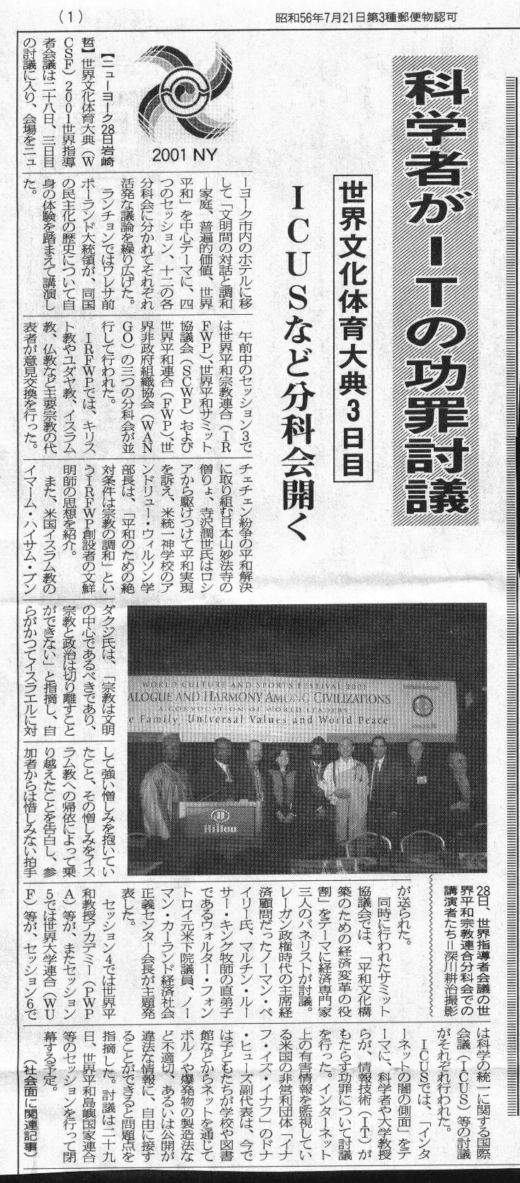 ●「世界日報」 2001年1月30日 第14面●